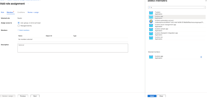 - Type the name of your app registration(e.g. Trustero-app in this example) and then select the trustero-app Icon that shows up