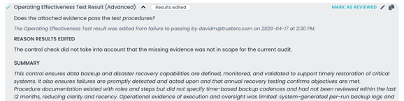 After running an operating effectiveness check or other control tests, you can review and override the results without losing the original AI analysis.