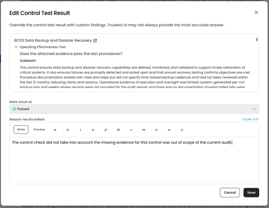 Overriding a control test result allows you to adjust the AI-generated outcome and provide justification for the change.