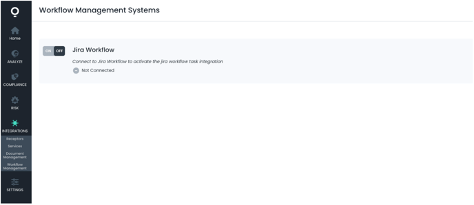 To enable the Jira Workflow Management Integration, navigate to the Workflow Management Systems Page through the Navigation Bar under INTEGRATIONS