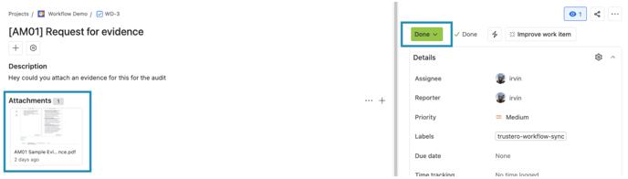 - Collect the attachments as evidence within Trustero when issues are set to Done