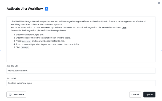 Trustero’s Jira workflow integration allows you to connect evidence-gathering workflows in Jira directly with Trustero, reducing manual effort and enabling smoother collaboration between systems. This guide covers how to use this integration.
