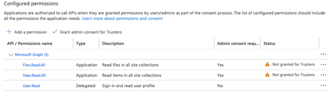 This document describes the steps to connect your Microsoft Cloud Platform Applications (e.g. Azure, Sharepoint, OneDrive, Active Directory, etc) with Trustero.