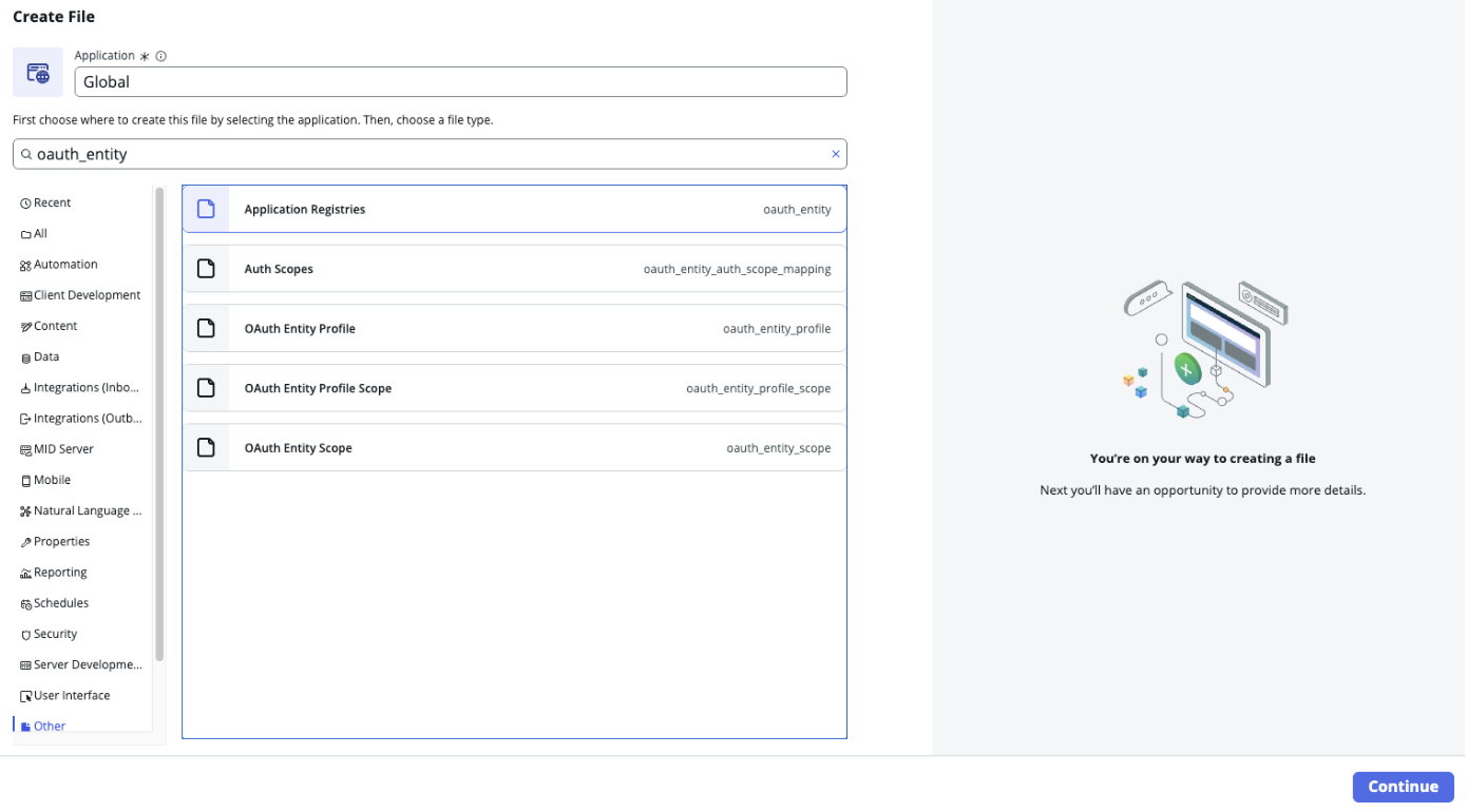 - Create an OAuth entity in the Application Registry by using Create File