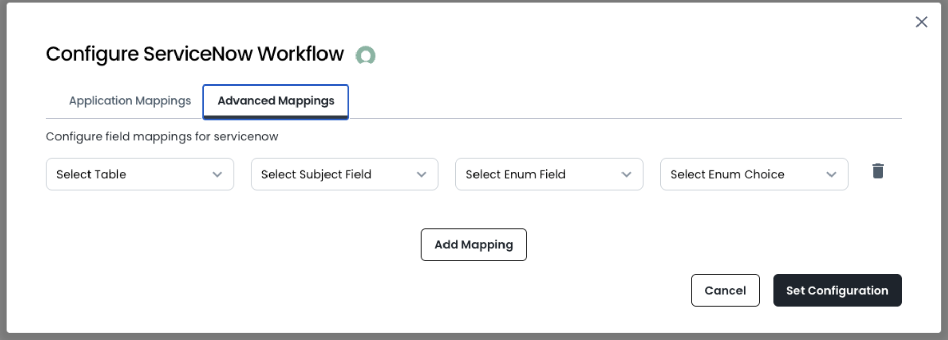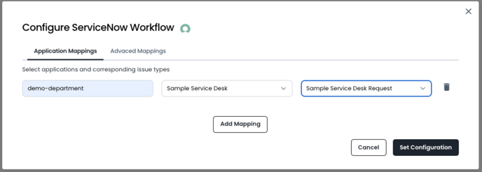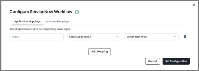 To configure the field mappings, open the configuration modal for the ServiceNow integration and switch to the Advanced Mappings