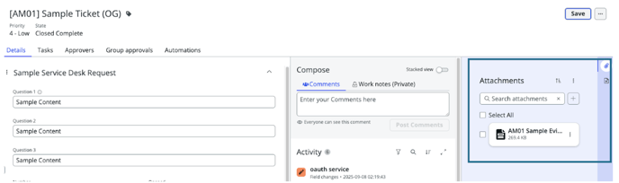 - You can still add attachments after the ticket is set to CLOSED_COMPLETE. The integration will find and add the evidence the next time it syncs with ServiceNow.