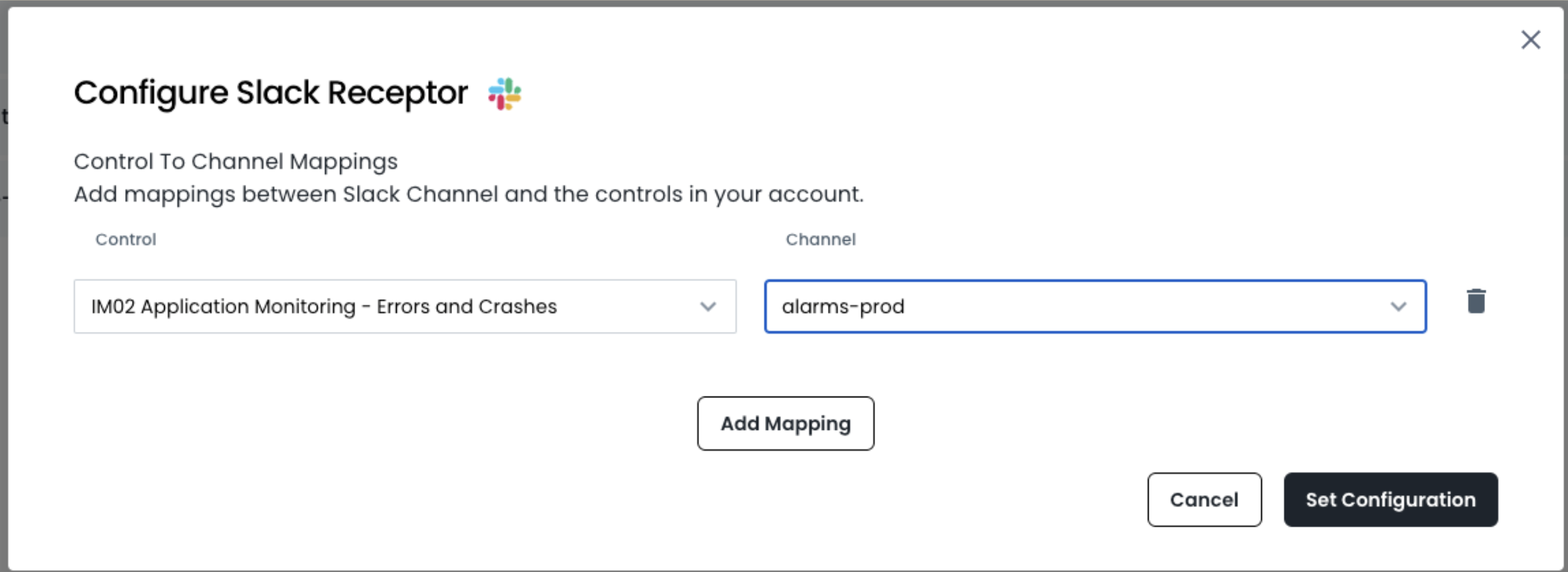 - Map control(s) to channel(s) - Slack receptor config with IM02 mapped to Alarms Channel