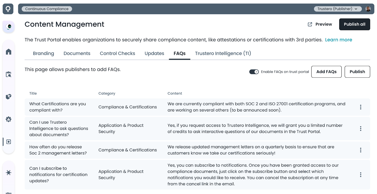 - Trust Portal Publishers (or Admins) go to the app; navigate to Customer Trust / Content Management / FAQs tab