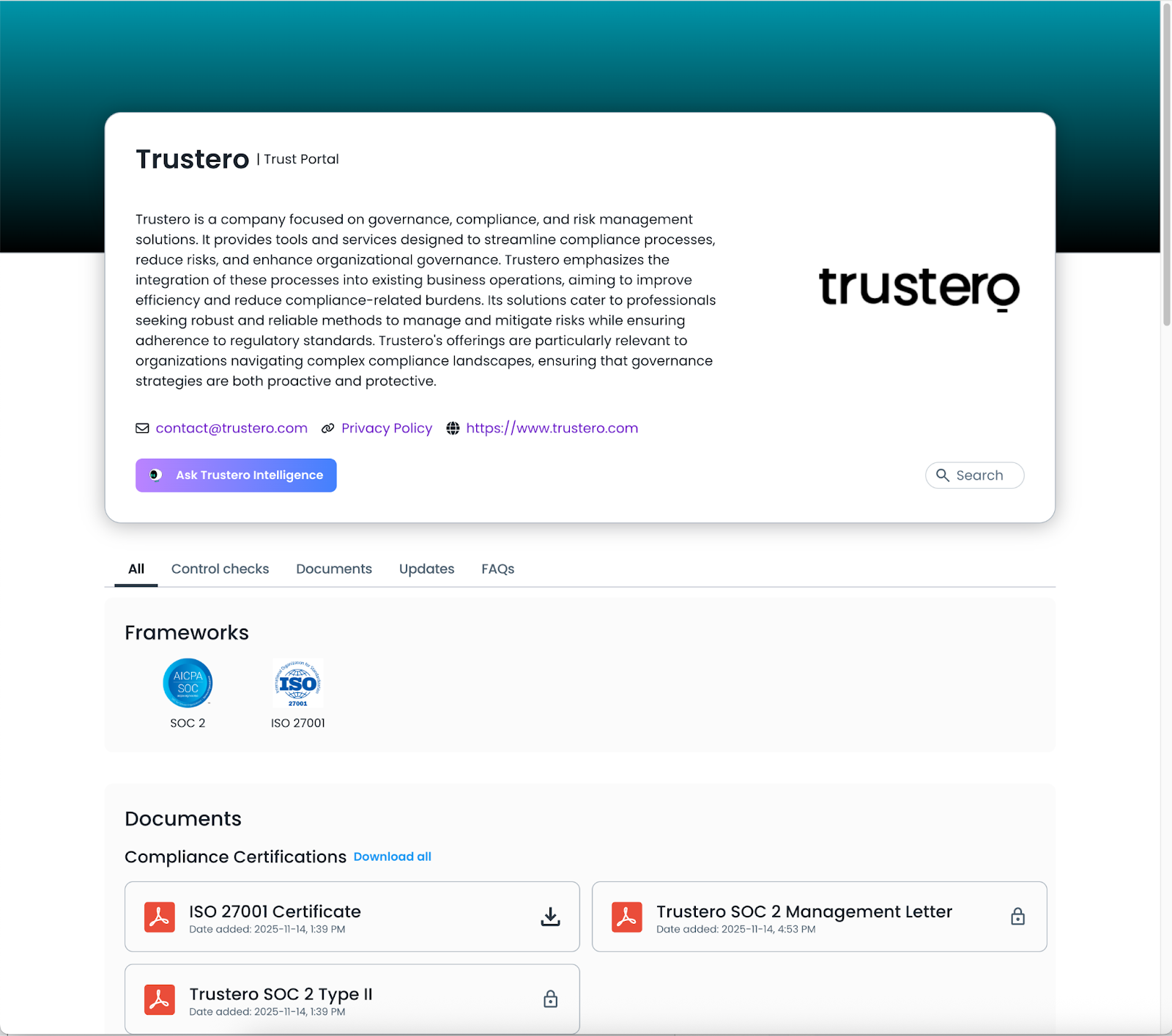 This tab lets publishers manage the overall look and feel of the Trust Portal visitors site. This also lets publishers select which compliance logos to include and modify the non-disclosure agreement that will be presented for confidential and restricted documents.