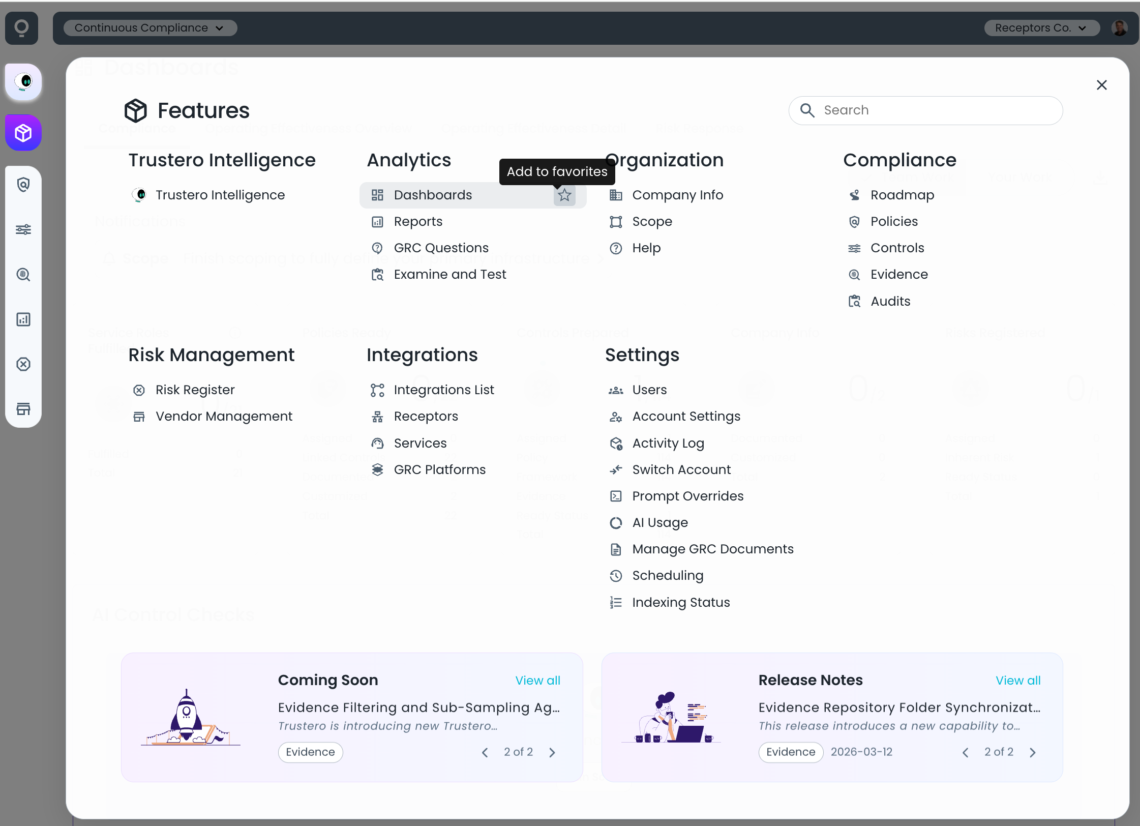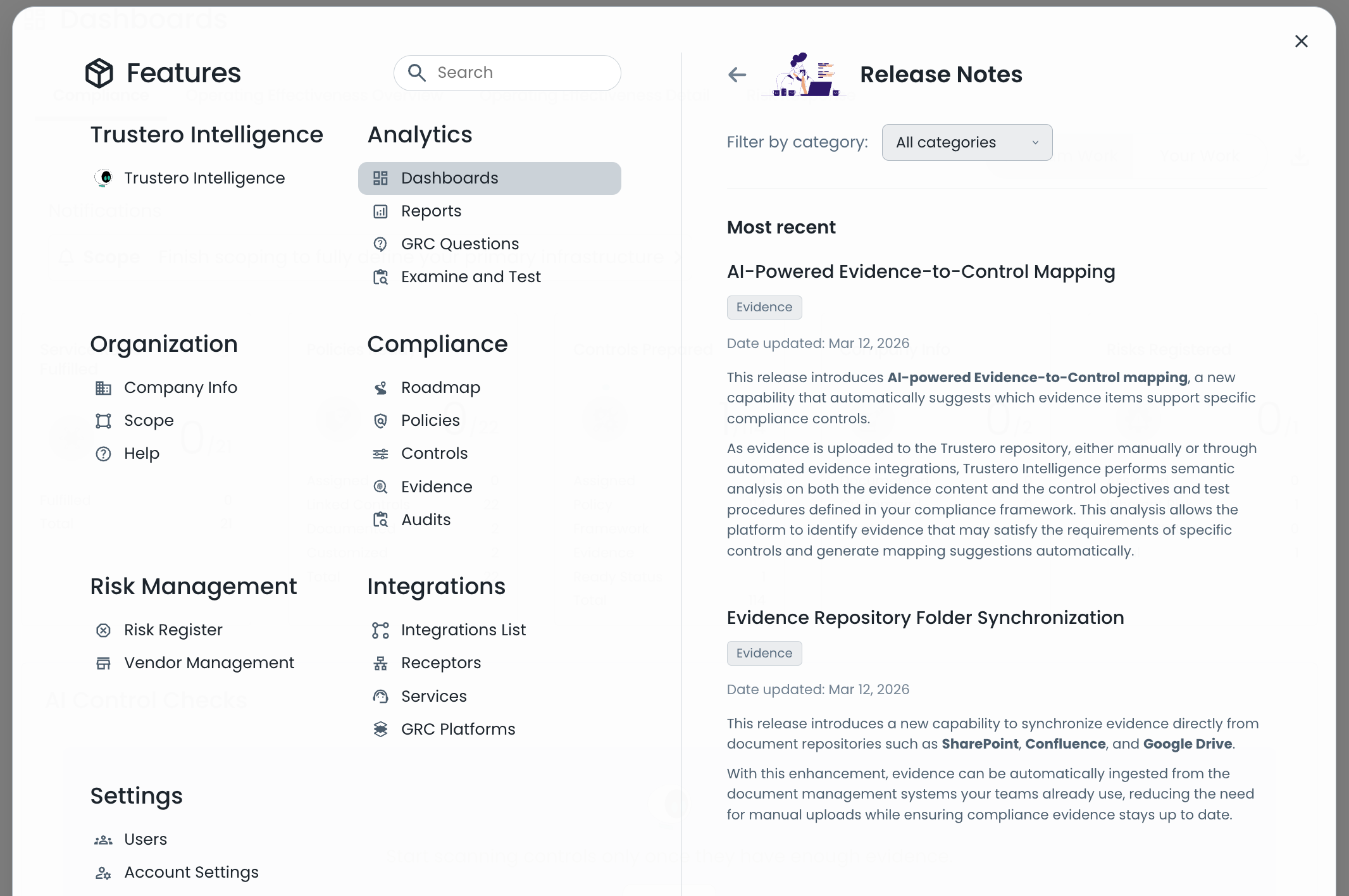 Trustero’s new Features page provides access to all product functionality in a single, organized view.